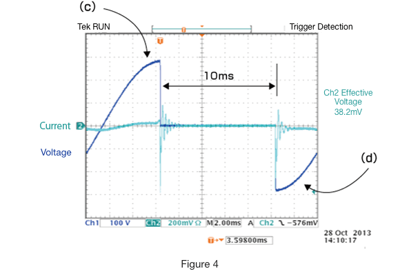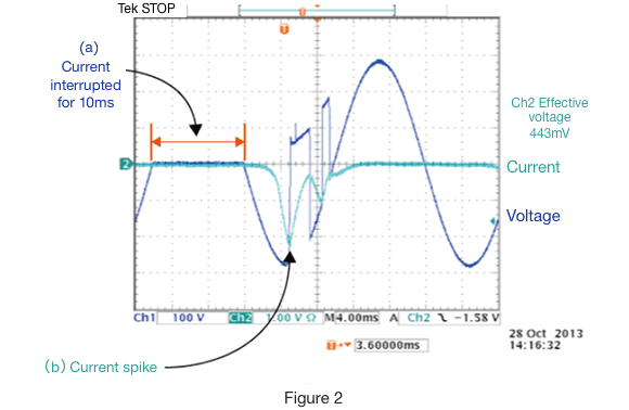 Figure 2 shows waveforms that were yielded when a PCR-LE series power supply was used to create a momentary interruption in the supply current. As you can see, when the current switches back on, the next negative portion of the sine wave causes a spike in current at point (b).